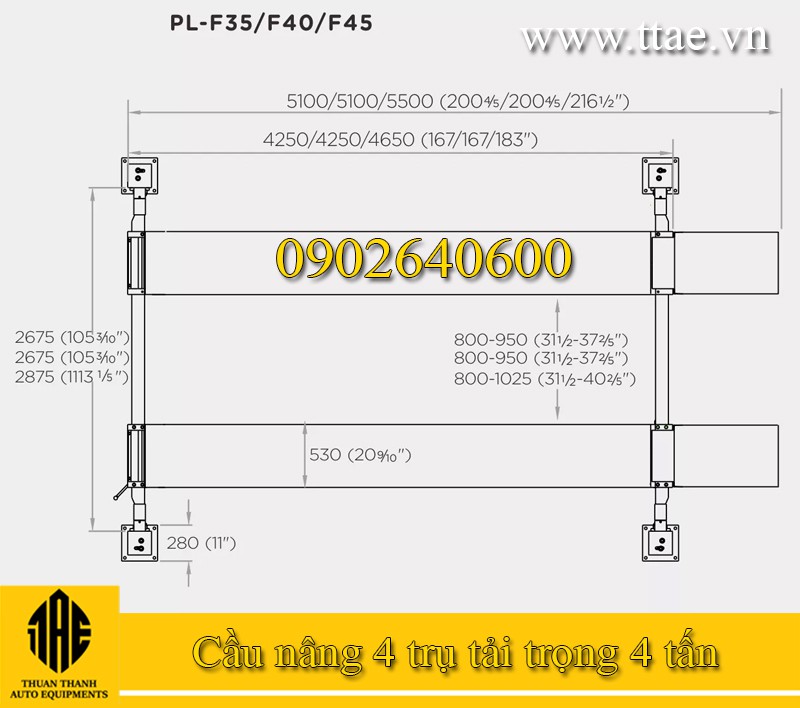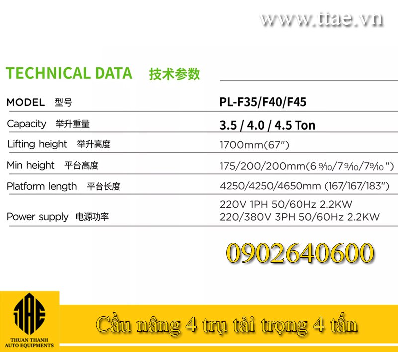 Thông số kỹ thuật cầu nâng 4 trụ Puli PL-F40