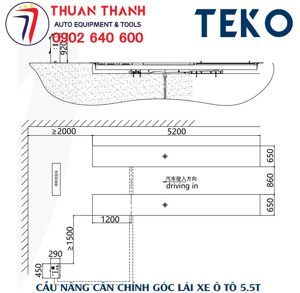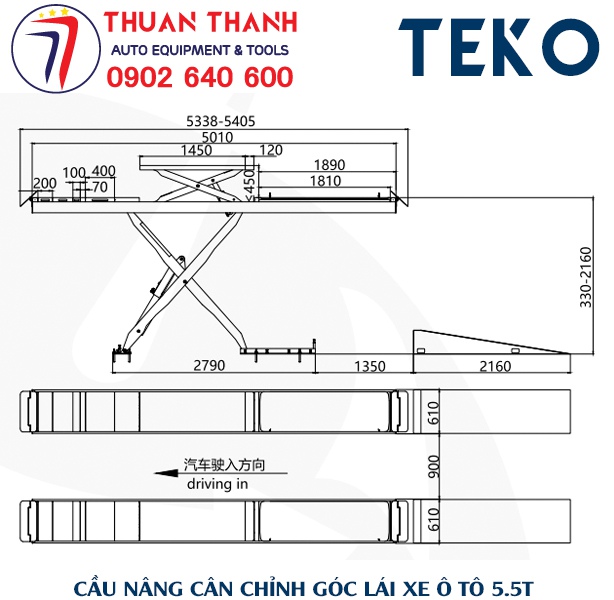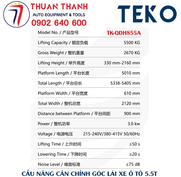 Thông số kỹ thuật cầu nâng cắt kéo cân chỉnh góc lái xe ô tô 5.5 tấn TK-QDH855A
