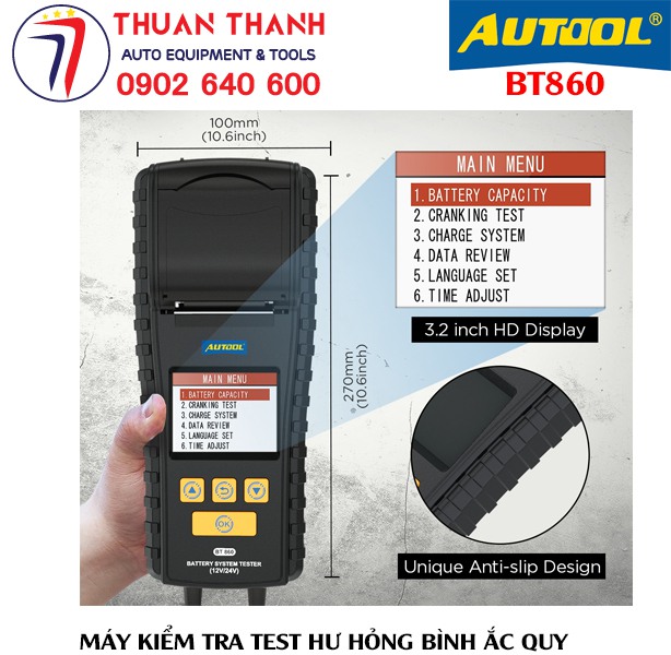 BT860, BT880, BT960 từ Autool là thiết bị bảo trì bảo dưỡng kiểm tra chuẩn đoán hỏng hóc trên bình ắc quy chất lượng cao đơn giản dễ dùng và độ chính xác cực cao được cung cấp bởi Thiết bị ô tô Thuận Thành