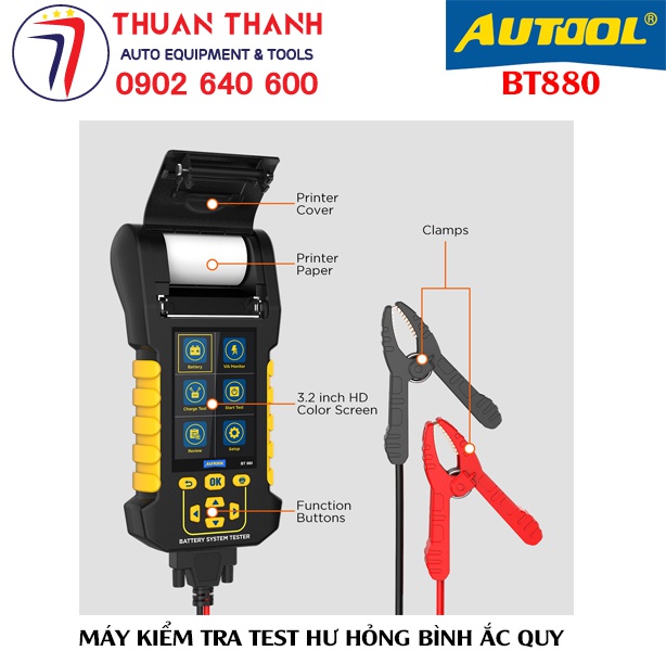 Autool BT880 là dòng máy kiểm tra bình ắc quy ô tô cao cấp, tích hợp máy in nhiệt, cho phép chẩn đoán toàn diện bình ắc quy, hệ thống khởi động và hệ thống sạc, đồng thời in kết quả kiểm tra trực tiếp để lưu hồ sơ hoặc giao cho khách hàng. Đây là thiết bị được đánh giá rất cao và đang được sử dụng rộng rãi tại garage lớn, trung tâm dịch vụ chính hãng, trạm thay thế ắc quy chuyên nghiệp.