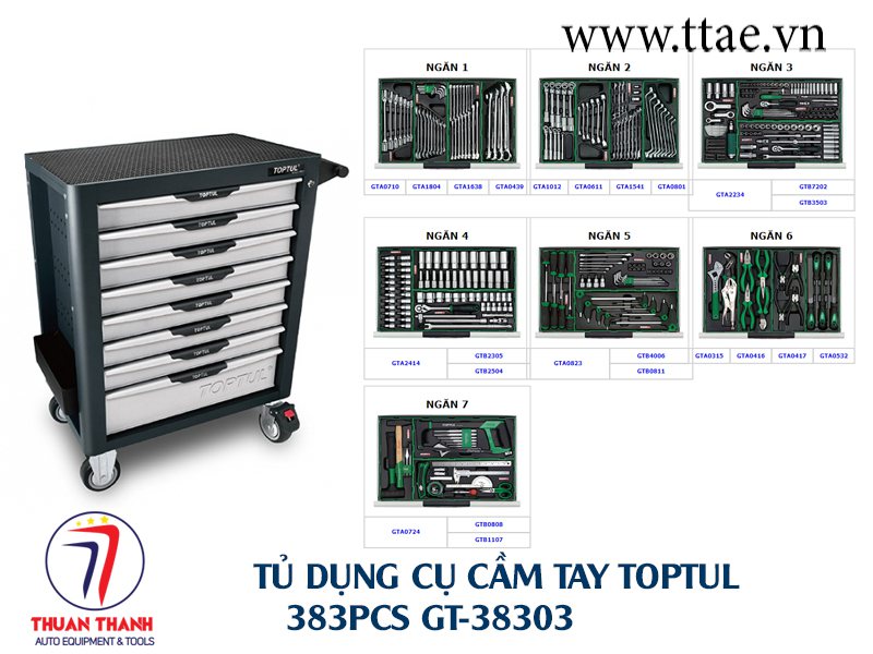 - Tủ dụng cụ đồ nghề cầm tay toptul GT-38303 là bộ tủ được sản xuất và sử dụng cho công việc sửa chữa thiết bị máy móc công nghiệp